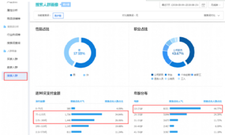 上图可以看到搜索跑步鞋的买家搜索点击人气最高的是75-135元,其次是135-190元,所以当你做跑步鞋的产品的时候只能选择一个价格带的产品,不能跨价格带,年龄分布都是年轻人比较多的,这种情况下我们的店铺装修风格以及详情产品图及装修风格我们都是要偏年轻化才行。