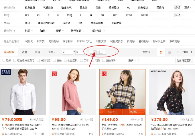 我们可以看到不同价格区间的牛仔裤分成了五个阶段。也就是说如果我们店铺主打女装产品,女装中又分为牛仔裤,连衣裙,衬衫等类型。就需要我们的这些产品类型的阶段相统一。