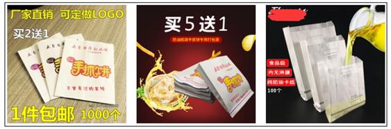 其实经过上面一点的分析,你基本应该知道主图应该怎么设计了。那就是通过进店关键词去分析消费者的本质需求到底是什么,然后把这个本质需求在首图当中展现出来。我们还是用上面的小吃纸袋举例,看另外一款单品: